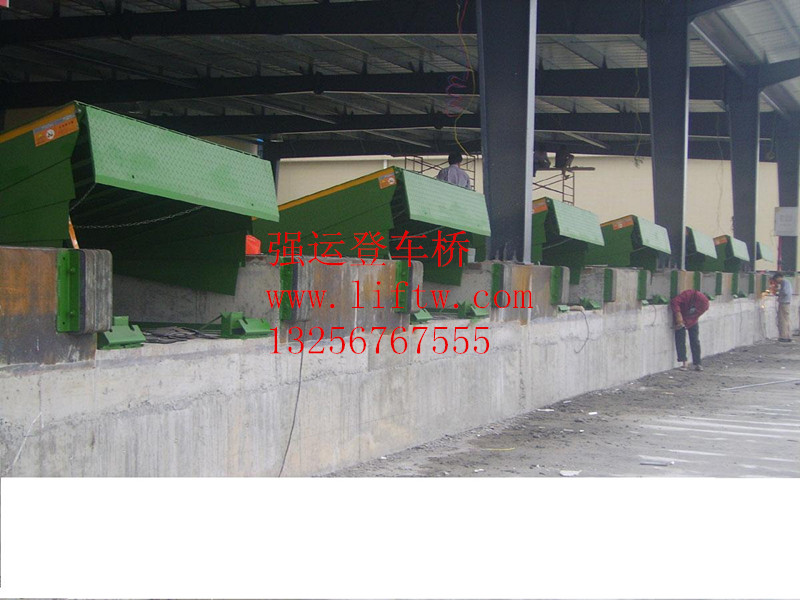 固定登車橋產(chǎn)品說明: 固定式液壓登車橋(又名:高度調(diào)節(jié)板/卸貨平臺或電動液壓月臺)是實現(xiàn)貨物快速裝卸的專用輔助設(shè)備,安裝在月臺、建筑物上,搭接于貨車車廂,調(diào)節(jié)月臺、建筑物地面與車廂之間的高度差。登車橋前端的可翻轉(zhuǎn)搭接扳在裝卸貨物時始終緊貼車廂。登車橋的角度調(diào)節(jié)功能使使貨車與建筑物地面之間架起一座橋梁,各種搬運車可順利通過登車橋,在建筑物地面與車廂間運送貨物。并且,只需一個操作工人作業(yè),即可實現(xiàn)貨物的快速裝卸。它使企業(yè)減少大量勞力,提高工作效率,獲取更大經(jīng)濟效益.是現(xiàn)代企業(yè)安全生產(chǎn),提高物料流通速度之首選。 固定式液壓登車橋的應(yīng)用:產(chǎn)品可根據(jù)用戶的不同需要,廣泛應(yīng)用于碼頭、站臺、倉庫等地。在外形尺寸,承受載荷等方面都可以作特殊設(shè)計。 固定式登車橋安裝在貨臺的側(cè)面,與貨臺地面和側(cè)面齊平。 固定式登車橋的橋板可上、下傾斜,其外端可高出或低于貨臺平面,使之與車廂等高。橋板的頂端有一翻板,自動搭在車廂邊緣,使貨臺與車廂平穩(wěn)過渡。 固定式液壓登車橋的特點: 1、電控操作只需按動按鈕,調(diào)節(jié)板會自動升起,操作極其簡單;松開按鈕,調(diào)節(jié)板靠自重下降, 活頁搭板搭在貨車上即可使用。 2、通過動力系統(tǒng),大油缸升起整個斜板,至頂位時,小油缸開始工作,順暢伸出活頁搭板, 高度調(diào)節(jié)板全部采用濟南濟鋼優(yōu)質(zhì)高度花紋鋼板及型材緊密焊接,壽命長久。 3、液壓系統(tǒng)采用意大利原裝進(jìn)口的優(yōu)質(zhì)品牌產(chǎn)品,性能卓越,極少維修。 4、獨特的"流線型"開放式活頁關(guān)節(jié)設(shè)計,比其它傳統(tǒng)的管式關(guān)節(jié)增加焊接面積達(dá)3倍以上,大大延長使用壽命,且方便維護。 5、調(diào)節(jié)板兩側(cè)分別有3塊活動板,可有效避免調(diào)節(jié)板下降時壓傷腳趾的危險,以確保安全。固定式登車橋調(diào)節(jié)板底座前面為開放式設(shè)計,清理雜物方便快捷。 6、獨特設(shè)計的"工"字鋼骨架能平均承托壓力,且減少骨架的扭力,比其他槽鋼結(jié)構(gòu)更堅固 耐用。 7、在維護、保養(yǎng)和清潔時,用撐桿支撐起調(diào)節(jié)板,更加安全可靠。 固定登車橋產(chǎn)品參數(shù): 型號起升高度(米)載重負(fù)荷(公斤)配套動力(kw)臺面尺寸(長*寬mm)外形尺寸(長*寬*高)mm 單機重量(公斤) DCQG6-0.6 +400\ -200 6000 0.75 2500*2000 2500*2000*700 700 DCQG8-0.6 +400\ -200 8000 0.75 2500*2000 2500*2000*700 850 DCQG10-0.6 +400\ -200 10000 0.75 2500*2000 2500*2000*700 1000 DCQG12-0.6 +400\ -200 12000 0.75 2500*2000 2500*2000*700 1150